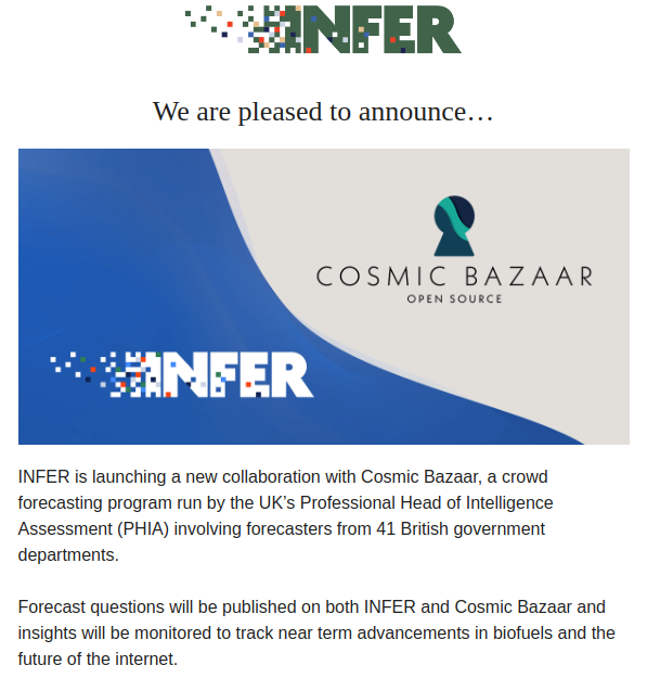INFER, short for INtegrated Forecasting and Estimates of Risk,"is a forecasting program designed to generate valuable signals and early warning about the future of critical science and technology trends and high-risk geopolitical events for U.S. Government policymakers"