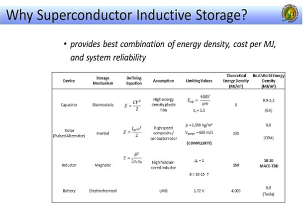 Electrical energy can be stored electrostatically in capacitors, inertially in the rotors of pulsed alternators, magnetically in inductors and electrochemically in batteries. It is obvious from the chart that the theoretical energy density of batteries is orders of magnitude higher than capacitors, but the internal resistance prohibits the energy from being extracted rapidly for pulsed power applications. Pulsed alternators potentially can achieve much higher energy and power density than capacitors but the complexity and necessary high rotating speeds have not led to a successful solution to date. Inductive storage is an attractive alternative, but the resistive losses have precluded a practical solution, until now. Advances in high temperature superconductors and their commercial availability as a result in the proliferation of medical magnetic resonance imaging machines have now enabled superconducting inductors to be serious candidates for compact pulsed power sources. The MACE superconducting pulsed transformer will provide an order of magnitude increase in energy and power density over the capacitor PFNs enabling significant reduction in size of the Navy power supply for their 32 MJ ship-based railgun and may enable MOBILE military systems for all of the military services.